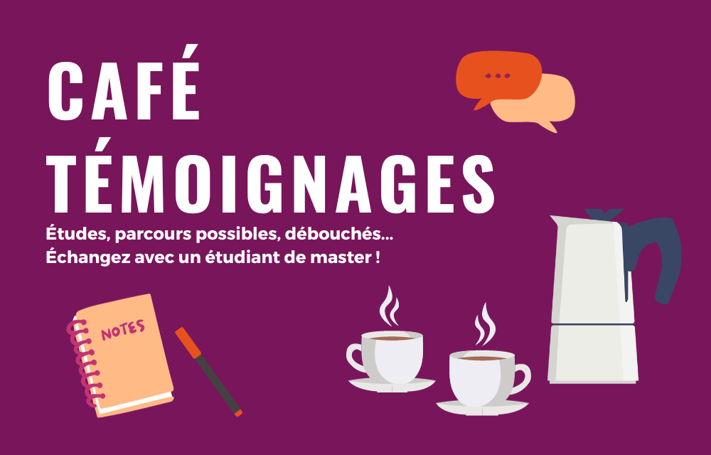 Le Centre d'Information, de Documentation et d'Orientation vous propose de nouvelles dates pour ses café-témoignages. L'objectif ? Permettre aux étudiants de licence d'échanger, le temps d'un café, avec des étudiants de master sur différentes thématiques : les études (charge de travail, méthodologie, stage...), les débouchés ou encore la vie quotidienne.