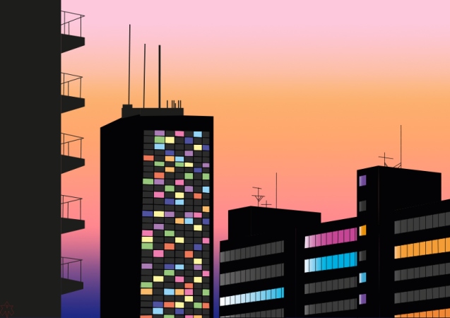 je peux observer les lumières chaudes des foyers dans les grands immeubles.