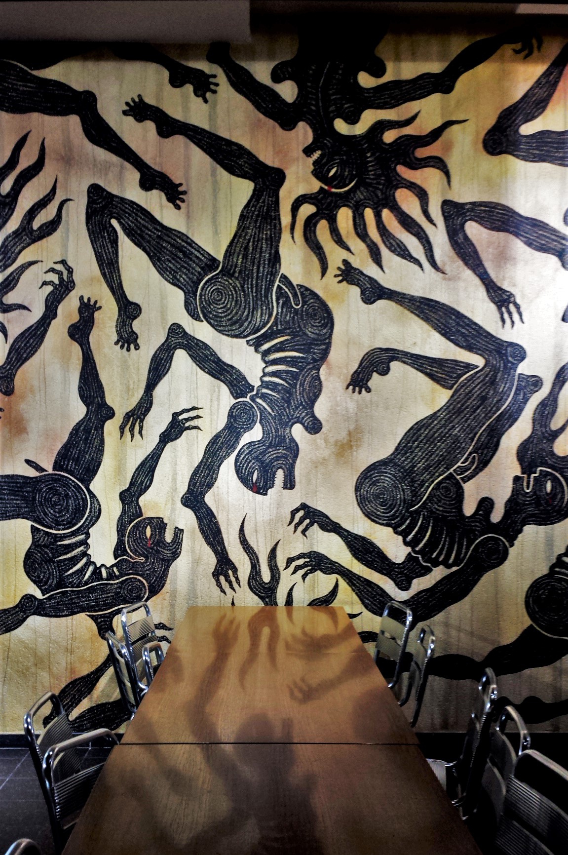 Catherine Ursin réalise, avec le soutien du CROUS de Lyon, une fresque sur un des murs du Resto’ U de la Manufacture des Tabacs à l’occasion de sa résidence en 2021. Composée de figures flottantes en apesanteur ou dans une eau enveloppante, elle pourrait faire écho au l?cher prise qu’incarne cet espace de restauration. Pourtant, l’expression grave de ces corps n’invite pas à la tranquillité : ces figures semblent abolir toute logique spatio-temporelle. Comme enfuis d’une céramique antique, elles envahissent un espace qui semble cl?t. Ce sont d’ailleurs des termes comme ? étouffement ?, ? plus de haut ni de bas ? ou encore ? sous-sol ? qui sont évoqués par les spectateurs à la vue de l’?uvre.