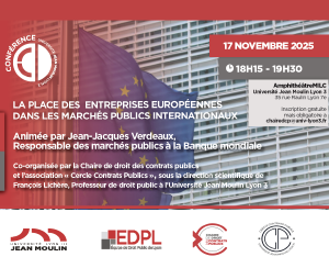 Jean-Jacques VERDEAUX, responsable des march¨¦s publics ¨¤ la Banque mondiale, interviendra sur ce sujet passionnant qui traitera de la concurrence dans les march¨¦s publics internationaux et de la place qu'occupent les entreprises europ¨¦ennes face aux autres entreprises ¨¦trang¨¨res (hors UE).