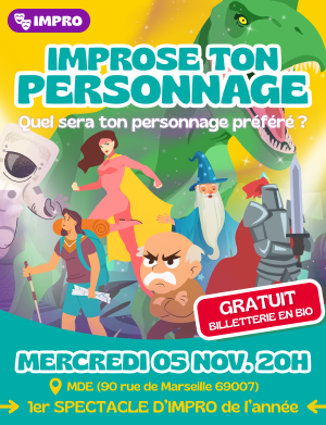 Un nouveau concept sur la base des suggestions des adh¨¦rents : un cabaret de jeux d'impro, mais ¨¤ la fin de chaque improvisation, le public choisit le personnage qu'il a envie de voir revenir dans l'impro suivante ! Alors, quel sera votre personnage pr¨¦f¨¦r¨¦ ?Spectacle 100 % impro ! - Par Imp(r)ose-toi!
