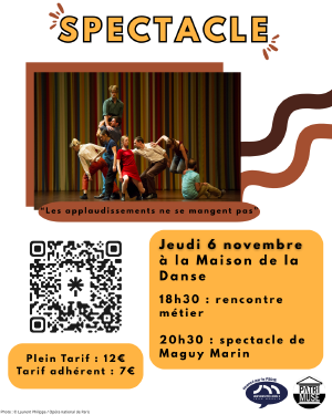 Patrimuse vous propose une soir¨¦e ¨¤ la Maison de la Danse ! Au programme rencontre m¨¦tier ¨¤ 18h30 puis venez d¨¦couvrir le spectacle de Maguy Marin ? Les applaudissements ne se mangent pas ? ¨¤ 20h30. Il est possible de r¨¦server le spectacle sans la visite (option gratuite).Rencontre m¨¦tiers et spectacle ¨¤ la Maison de la Danse - Par Patrimuse