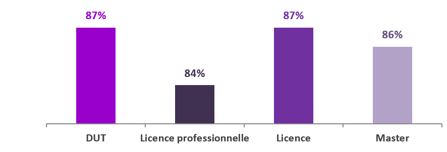 95% des inscrits en année terminale de BUT ont obtenu leur dipl?me. Ils sont 85% parmi les inscrits en licence professionnelle*, 86% pour les inscrits en licence* et 89% en master*.
