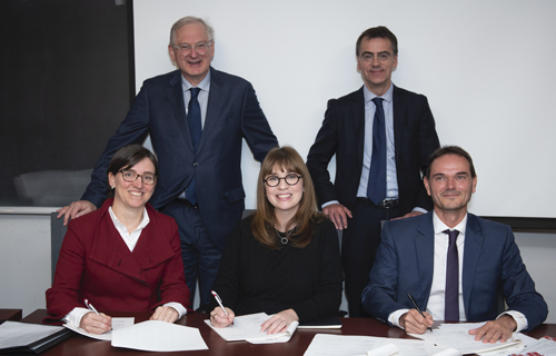 Caption, top photo: Signing the agreement, with, from l. to r. (front row): Marie-Eve Sylvestre, Dean - Civil Law Section; Mariève Lacroix, chair holder - Civil Law Section; Olivier Gout, chair holder - Jean Moulin Lyon 3 University; and (back row): Jacques Frémont, Rector - University of Ottawa; and Jér?me Bresson, Minister-Counsellor of the French Embassy in Canada.