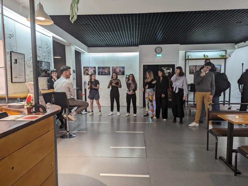 Printemps 2022Les étudiants ont investi le hall du thé?tre avec leur corps, comme un vrai terrain de jeu, danser au milieu du public qui attend pour récupérer ses billets, rendre hommage à Pina Bausch et sa Nelken Line sur les marches du thé?tre du Point du Jour, en attendant les retardataires, chansigner une chanson fran?aise kitch et célèbre des années 70 et signer quelques phrases d’un poème écrit par un artiste sourd, Anthony Guyon.