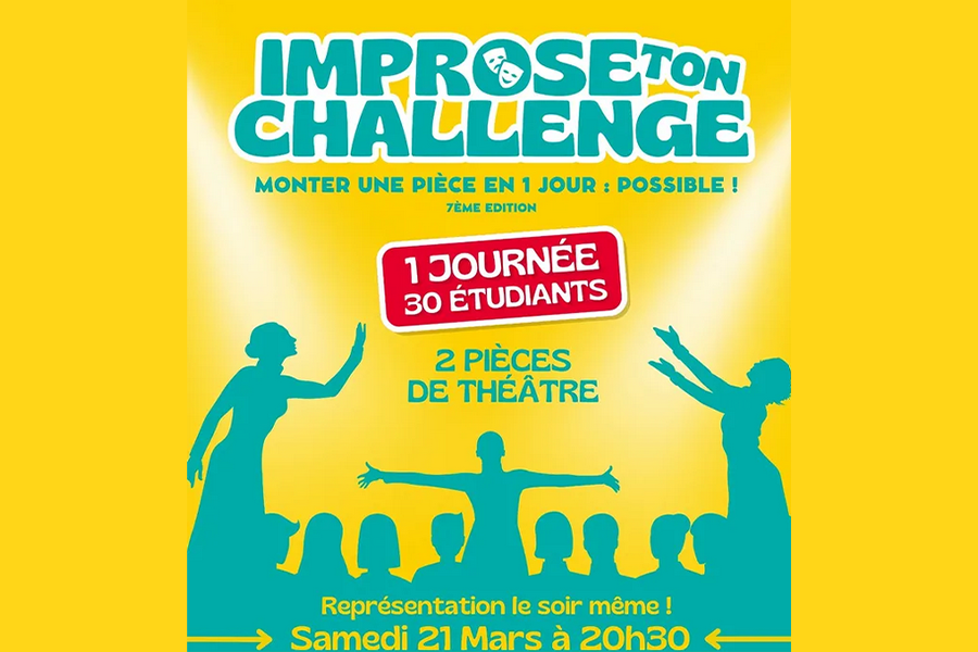 Ateliers de prise de parole, de thé?tre et d’improvisation animés par des professionnels. Septième édition du Challenge d’improvisation organisé par Imp(r)ose toi, association des étudiants apprentis orateurs de l’iaelyon. Evènement gratuit et ouvert à tous les étudiants – participants ou spectateurs - sur inscription.