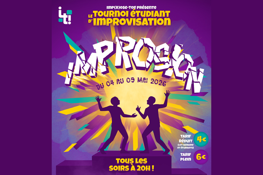 Organis¨¦ par l¡¯association Imp(r)ose toi ! , ce tournoi propose aux ¨¦tudiants (et curieux) de d¨¦couvrir l¡¯improvisation sous forme de comp¨¦tition conviviale. Chaque soir, des apprentis com¨¦diens issus de diff¨¦rents ¨¦tablissements (Universit¨¦ Jean Moulin Lyon 3, iaelyon, INSA Lyon, ENS Lyon, Centrale Lyon, Universit¨¦ Jean Monnet Saint-Etienne), ainsi que des troupes de Grenoble et Paris, se rencontreront pour des matchs uniques et 100 % improvis¨¦s.