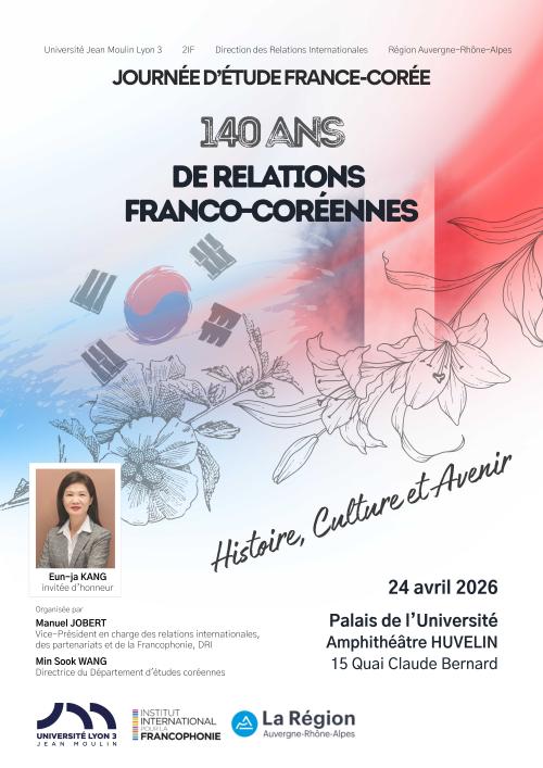 ? l’occasion de cet anniversaire, l’Institut International pour la Francophonie - Direction des relations internationales et le Département d'études coréennes de la Faculté des langues de l’Université Jean Moulin Lyon 3 organisent, avec le soutien de la Région Auvergne-Rh?ne-Alpes, une journée d’étude sur le thème ? 140 ans de relations franco-coréennes : histoire, culture, avenir ?, le 24 avril 2026, en amphithé?tre Huvelin, de 8h30 à 17h30. Celle-ci s’inscrit dans le cadre du French Asian Hub (FAH), la stratégie asiatique de l’Université.