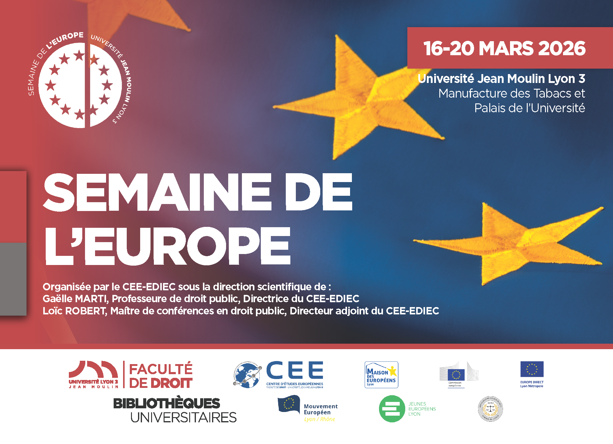 Venez découvrir l'Europe autrement ! Pour la sixième édition de la Semaine de l'Europe, le CEE-EDIEC, la Faculté de droit de l'Université Jean Moulin Lyon 3 et leurs partenaires (les Bibliothèques universitaires de Lyon 3, la Maison de l'Europe et des européens Lyon Rh?ne-Alpes, le Mouvement européen Lyon-Rh?ne, Europe-Direct, le Collège de droit et les Jeunes européens Lyon) vous proposent une série de conférences, projections de films, débats, animations, ateliers ainsi qu'une exposition !